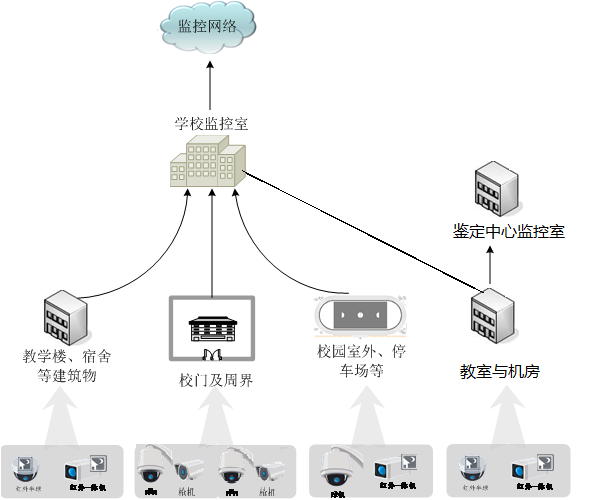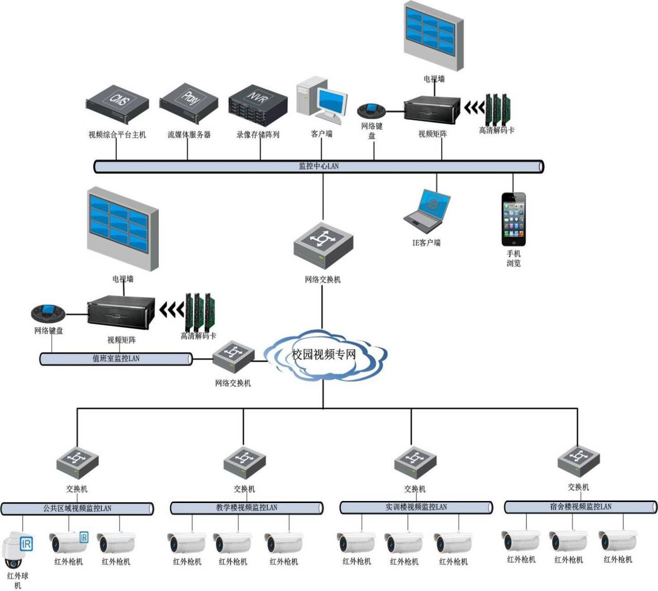 (1)分校區現有的監控點遍布學校各個重要點位,包括教學樓、一體化樓、實訓樓、辦公樓、學生宿舍、學生食堂、校內重要場所等。通過光纖鏈路將前端各個點位匯聚到監控中心,并統一傳到監控中心集中存儲。
